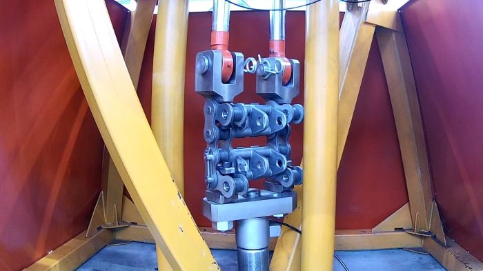 Для проведения силовых испытаний цепи был спроектирован и изготовлен испытательный стенд. За основу был взят стенд для проведения силовых испытаний инжекторов. Испытание проводилось поэтапно, с плавным увеличением нагрузки на каждом этапе, при фиксированном времени выдержки. Между этапами проводилась разборка цепи, визуальный осмотр и проверка линейных размеров деталей цепи. Испытание цепи пройдены успешно.